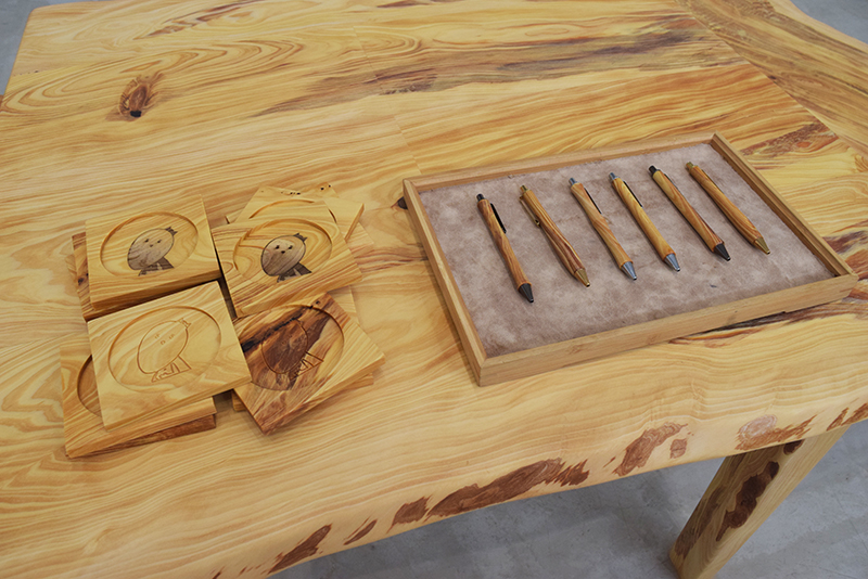 今年の見どころは、街中で伐採された木を使った作品を展示する「SDGsコーナー」。旧豊見城村役所庁舎の解体に伴って伐採された樹齢60年のリュウキュウマツで作られたコースターやペンなど=写真=がお披露目された。