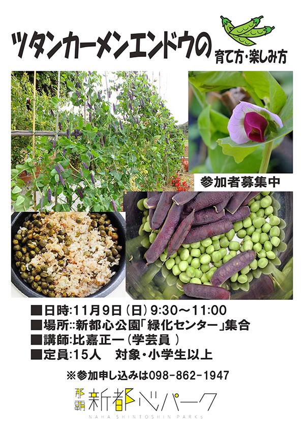 美しい花と紫色のサヤを付け、豆も食べられるとして人気の「ツタンカーメンエンドウの育て方・楽しみ方教室」が、那覇市おもろまちの新都心公園で11月9日(日)午前9時30分から開かれる。参加無料。定員は15人で小学生以上が対象。