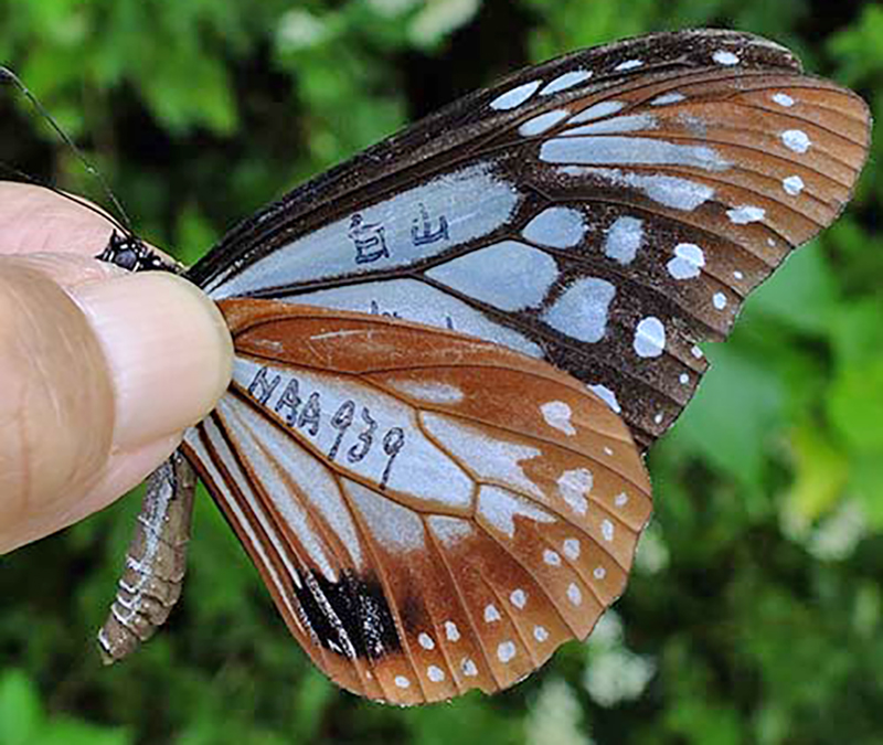 アサギマダラの渡り調査は、発見者が翅にマーキングをする。写真は今月、北部半島に飛来した個体。石川県から47日かけて1354キロも移動したことが分かる