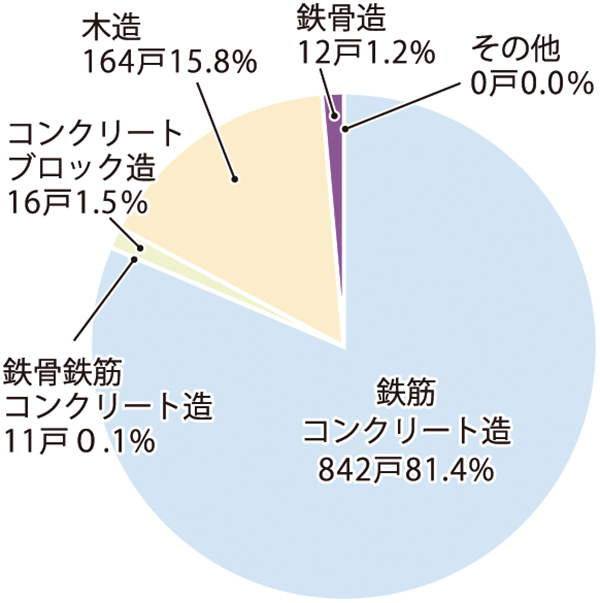 構造別では、鉄筋コンクリート造が最も多く842戸で81.4%を占めた。次いで木造が164戸で15.8%だった。