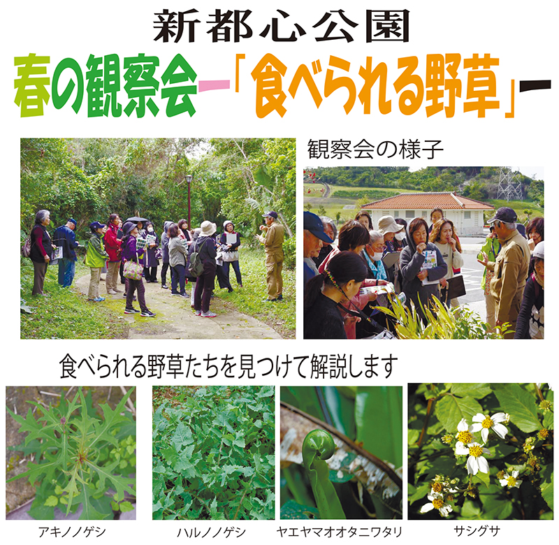 2026年1月9日 [情報]食べられる野草や毒草学ぶ|新都心公園で1月11日に無料観察会 那覇市おもろまちの新都心公園で1月11日(日)午前9時30分から「春の観察会 食べられる野草」が開かれる。参加無料。 講師は、本紙で「身近で見られる帰化植物」を連載している比嘉正一さん。一緒に公園を散策しながら、食べられる春の野草や、毒植物について解説する。 事前に予約が必要。定員は15人で、達し次第締めきり。 申し込み・問い合わせ 新都心公園 電話=098・862・1947 < 前の記事へ 一覧に戻る 次の記事へ >