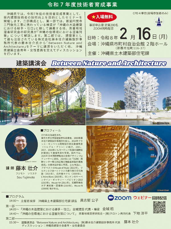 [情報]藤本さんら専門家3人が登壇|2月16日那覇市で建築講演会 オンライン配信も