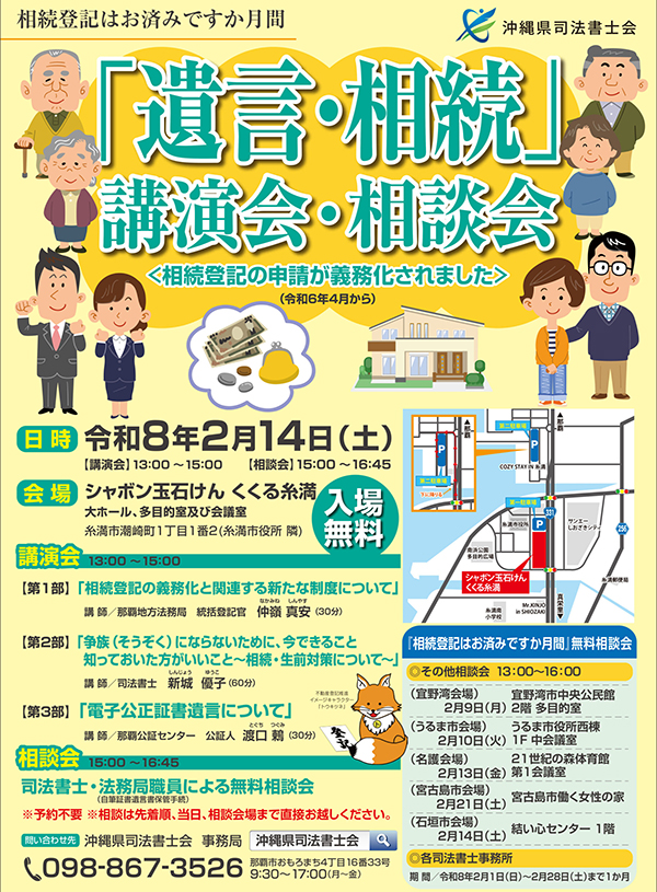 2月14日(土)午後1時~同3時、糸満市の「シャボン玉石けん くくる糸満」で相続登記の義務化や関連する新たな制度、もめないための生前対策、電子公正証書遺言などの講演会を開催する。同3時からは司法書士・法務局職員による無料相談会を実施する。予約不要で、先着順での対応。