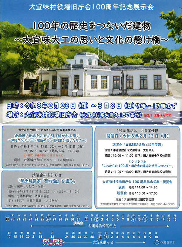 沖縄に現存する最古のコンクリート建築物とされる大宜味村役場旧庁舎の記念展示会「100年の歴史をつないだ建物~大宜味大工の思いと文化の懸け橋」=写真=が2月23日(月)~3月8日(日)、同庁舎で開かれる。23日にはシンポジウムや記念式典なども行われる。