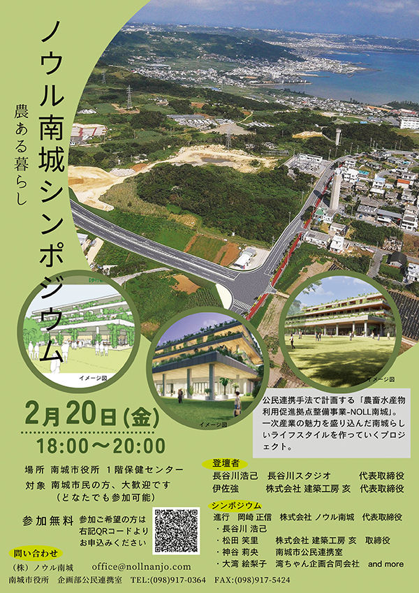 南城市で計画中の公民連携のプロジェクト「農畜水産物利用促進拠点整備事業~NOLL(ノウル)南城」の建築や景観づくりの計画発表と、シンポジウムが2月20日(金)午後6時から、南城市役所で開かれる。南城市民以外でも、同事業に関心があれば参加できる。