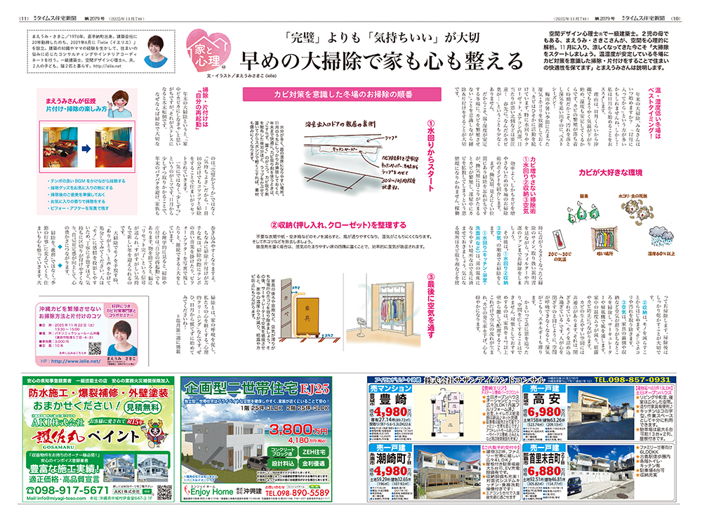 | 10-11P | [家と心理]「大掃除は11月からスタートを」沖縄の空間デザイン心理士が勧めるワケ カビを増やさない掃除法も解説 |